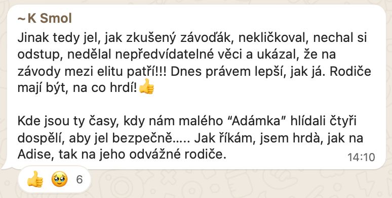 A přesně tohle je jeden, resp. možná dva, z příkladů toho, že smysluplná vytrvalá činnost má smysl. Bez vytrvalosti, cílevědomosti a urputnosti Adama by se nestalo to, že hned svůj první závod v dospělácké kategorii vyhraje. Možná by se ho vůbec nezúčastnil, jelikož svým stavem příliš nezapadá do žádné para kategorie a přestože chce závodit, tak mu to téměř nikde neumožní. A stejně tak by se to možná nestalo ani bez vytrvalosti, cílevědomosti a urputnosti všech, kteří se ve svém volném čase věnují Kolu pro Adama a Adamovi přímo.