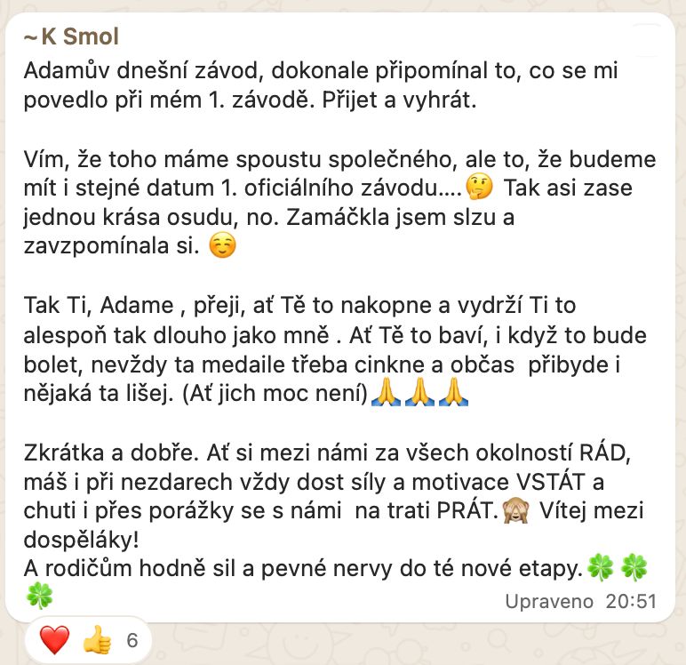 To ale není jediná paralela, která se mezi jejich příběhy nachází. Je možné, že se stane, že se v rámci sbírky obdarují ve stejný rok dvě děti, které své dospělácké závody zahájí ve stejné datum, jen několik let po sobě? A ať neškudlím, neuvedu sem jen tu informaci o stejném datu, ale rovnou i celé přání, které Adamovi Katka od srdce poslala, protože takových slov není nikdy dost a jen moct si je přečíst, i když nesměřují nám osobně, je krásné: